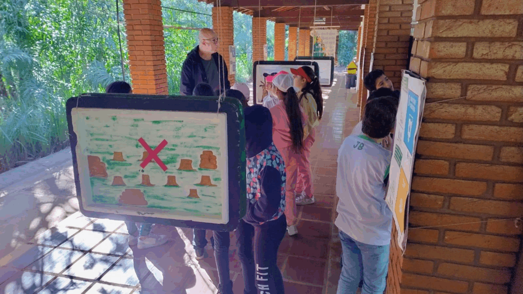 O professor Alexandre, responsável pedagógico pela atividade, conversou com os estudantes sobre temas essenciais como o cuidado com o lixo, a importância da água limpa e o papel de cada um na proteção do meio ambiente.