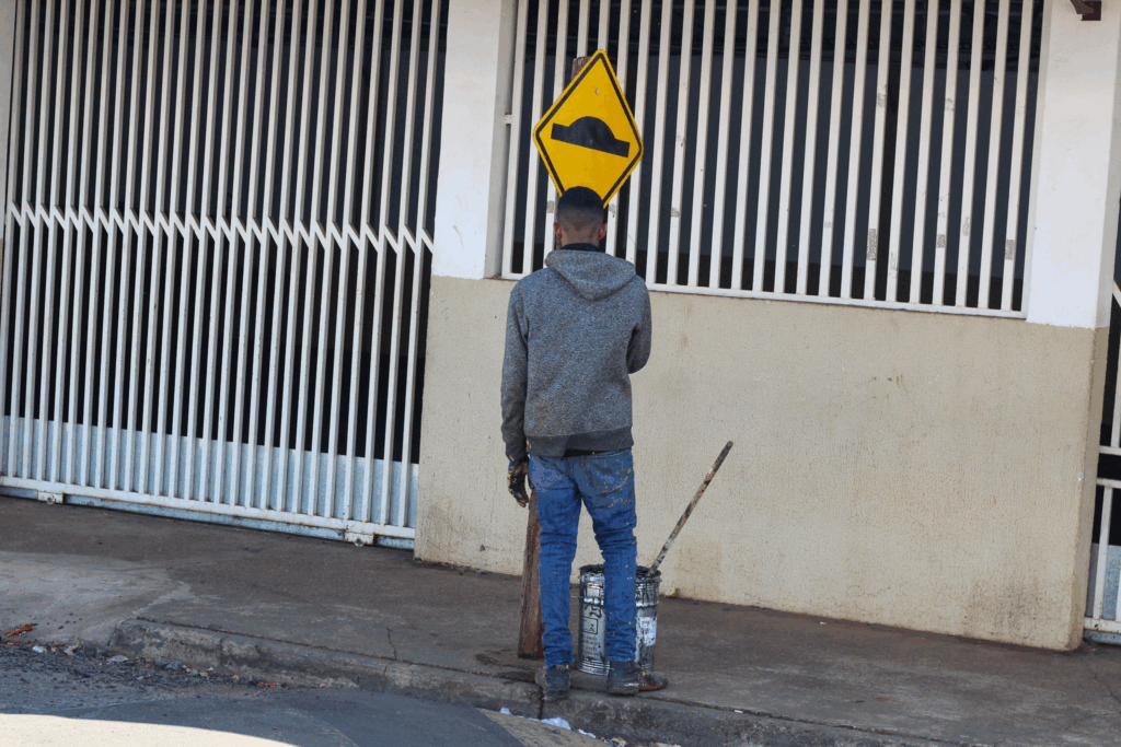 No dia 10 de julho, o Departamento de Trânsito e Transporte realizou ações de pintura de lombadas e instalação de sinalização vertical com placas indicativas em dois importantes pontos da cidade: