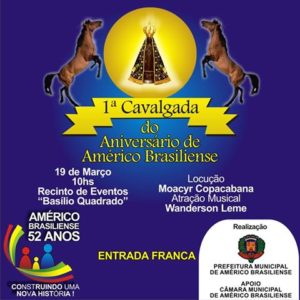 No dia 19 de março de 2017, no Recinto de Eventos “Basílio Quadrado”, às 09h00min acontecerá a 1ª Cavalgada do Aniversário de Américo Brasiliense. O evento terá a participação das Comitivas locais e de toda a região. A animação ficará por conta do Locutor Moacyr Copacabana, seguida da atração musical Wanderson Leme.