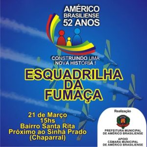o foi a mais de uma década, quando ainda eram utilizados os ultrapassados aviões T-27. A Esquadrilha da Fumaça pertence a uma Instituição Pública, a Força Aérea Brasileira (FAB) e realiza várias demonstrações durante o ano não cobrando nada dos municípios. Com essa demonstração os céus de Américo Brasiliense ficarão mais emocionantes na comemoração dos seus 52 anos de emancipação político – administrativa.
