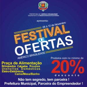A Prefeitura de Américo Brasiliense convida a todos, para participar do 1º Festival de Ofertas que acontecerá nos dias 8,9 e 10 de novembro!