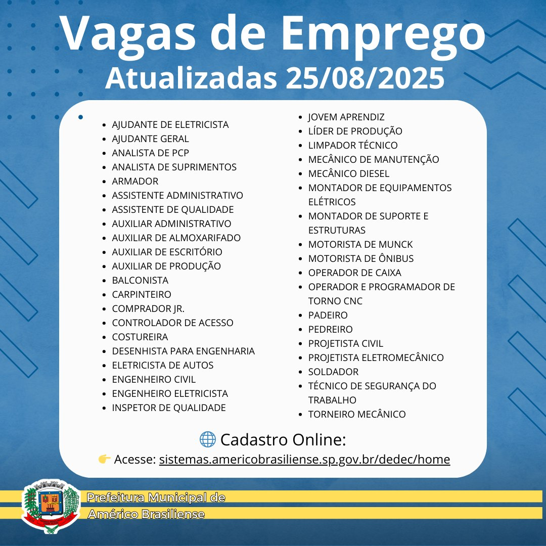 Confira as vagas disponíveis no DEDEC: Vagas DisponíveisAjd. de Eletricista