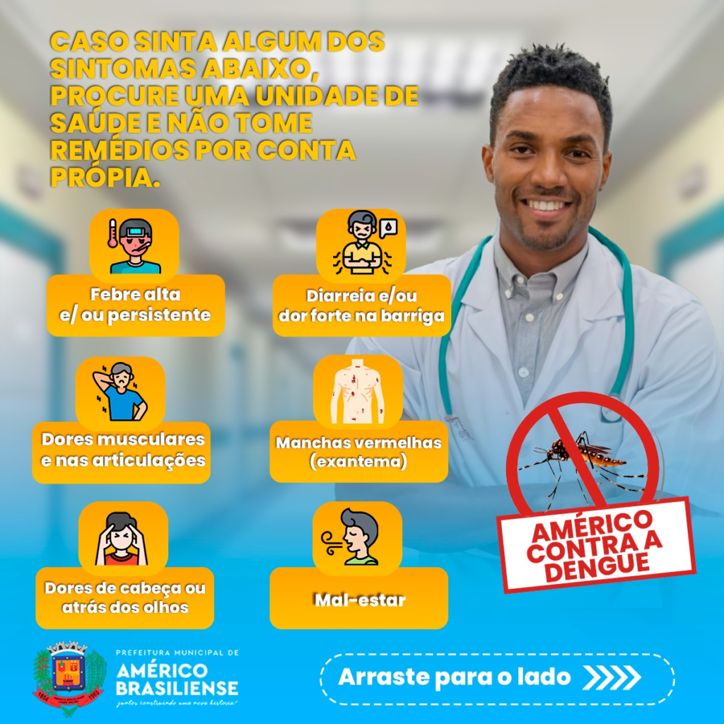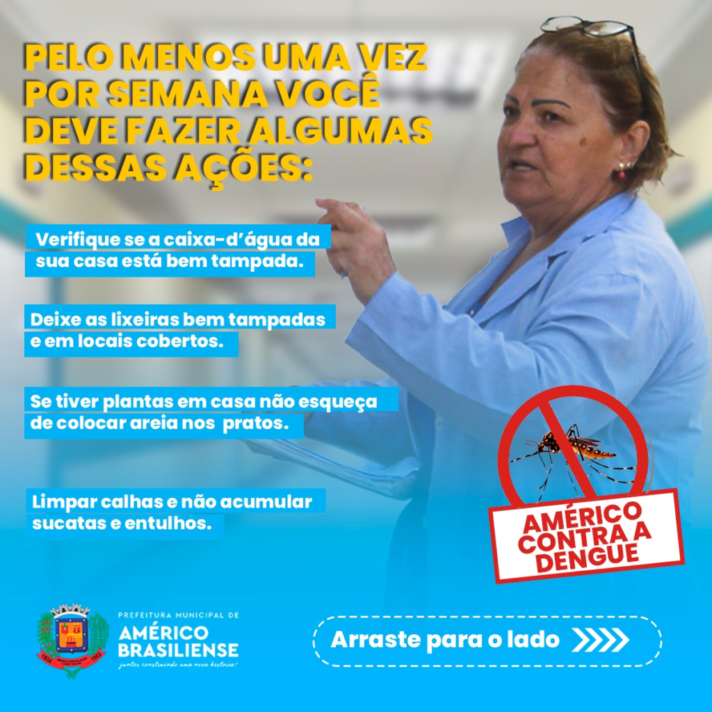 A Prefeitura Municipal de Américo Brasiliense, por meio da Secretaria de Saúde, em parceria com o Setor de Vetores e Zoonoses, vem reforçar a importância da colaboração de toda a população no combate ao mosquito Aedes aegypti, transmissor de doenças como dengue, zika e chikungunya. É fundamental adotarmos medidas preventivas para evitar a proliferação do vetor e, consequentemente, a ocorrência dessas enfermidades.