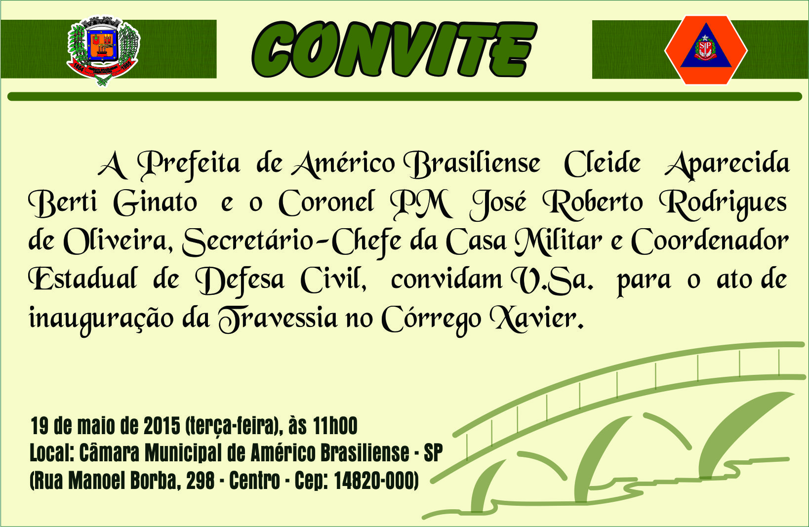 Convidamos toda a população para o Ato  de inauguração da Travessia do Córrego Xavier, nesta terça – feira – 19/05/2015, às 11hs:00, na Câmara Municipal de Américo Brasiliense, Rua Manoel Borba, 298.