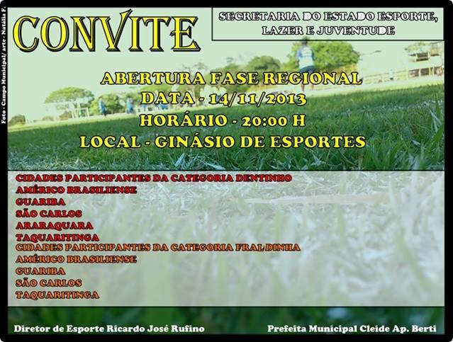 Convidamos a todos para participarem da Abertura da Fase Regional de Futebol que Américo Brasiliense estará sediando, bem como para que participem dos jogos qua acontecerão nos dias 14/15/16 e 17 de Novembro de 2013.