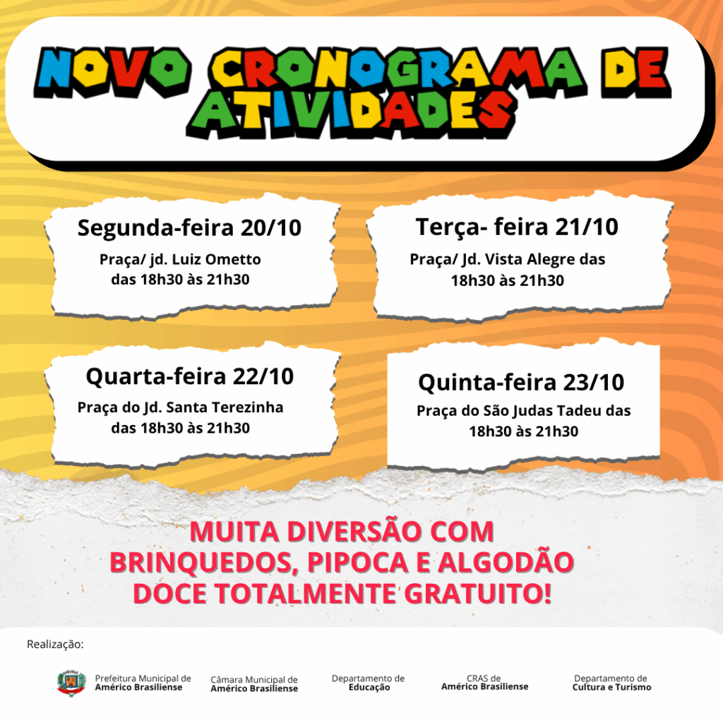 A Prefeitura de Américo Brasiliense, por meio dos Departamentos de Cultura e Turismo, Educação e do CRAS, realiza nesta quarta-feira, 22 de outubro, mais uma edição da Festa das Crianças, na Praça Jaime Viana Rocha, no Jardim Santa Terezinha.