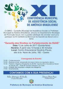 No dia 13 de Julho de 2017, à partir das 13 horas e 30 minutos, no auditório do Centro Educacional e Apoio Pedagógico “Novênio Pavan” o Município de Américo Brasiliense realizará a XI Conferência Municipal de Assistência Social, com o tema: “Garantia de Direitos no Fortalecimento do SUAS”.